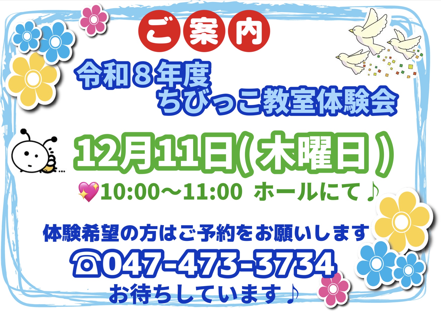 🐤 体験会をご希望される方は、お電話で事前予約の上ご参加ください。