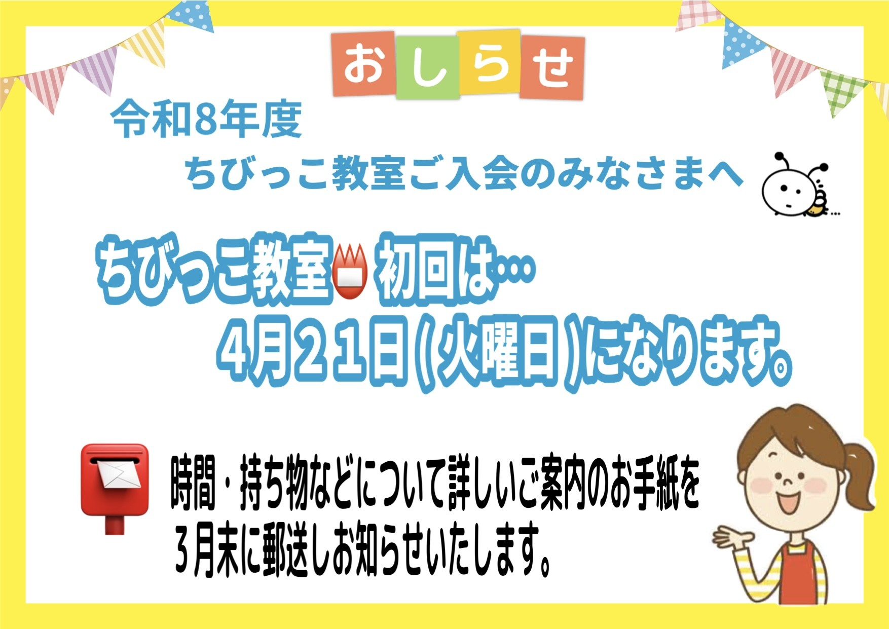 ちびっこ教室のお申込みされた方には「ご案内のお手紙」を3月末にご自宅へ郵送いたします。